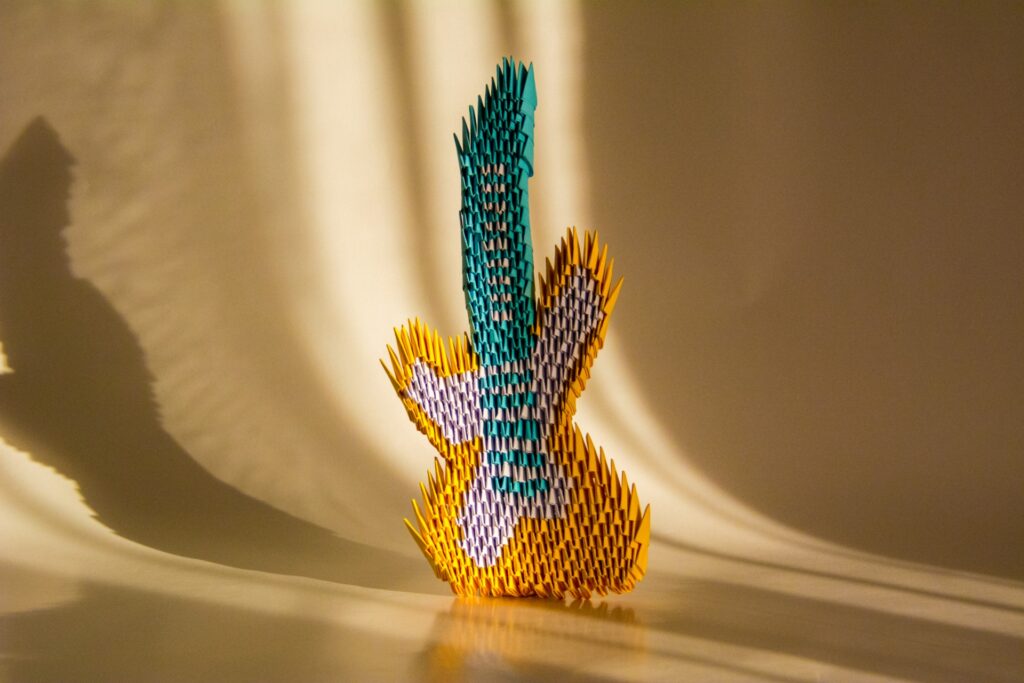 Anlässlich meines 50. Geburtstags wurde ich mit einem außergewöhnlichen Geschenk überrascht: einer Gitarre, die vollständig aus zahllosen kleinen Papierstücken kunstvoll zusammengesetzt war. Als leidenschaftlicher Musiker, der seit seiner Jugend in verschiedenen Bands gespielt hat, berührte mich dieses mit so viel Geduld und Liebe gefertigte Geschenk zutiefst. Die filigrane Handarbeit und die symbolische Bedeutung dieses Instruments rührten mich zu Tränen. Eine solch aufwendige Arbeit verdient es, in einer eigenen Galerie gewürdigt zu werden.
