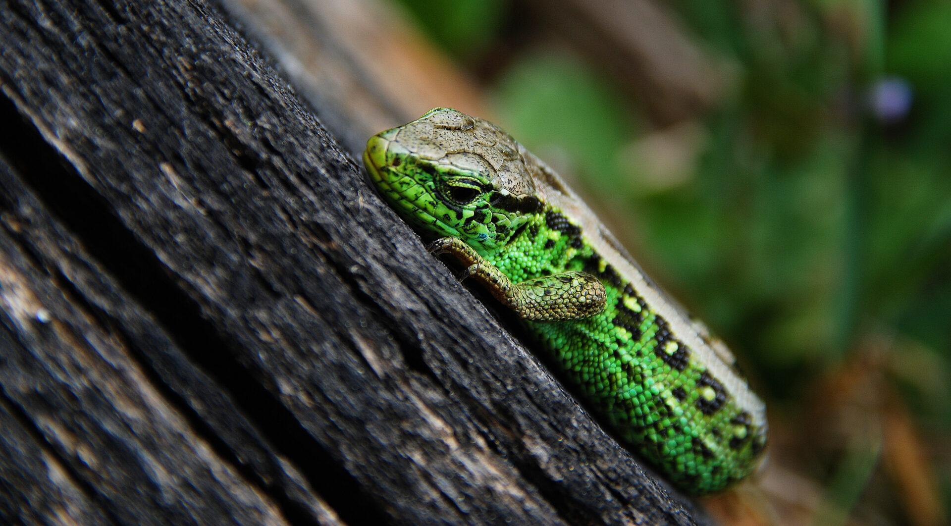 35 Grad im Schatten. Ich war auf dem Rückweg, völlig fertig von der Hitze, als ich diese kleine Eidechse entdeckte. Sie lag auf dem alten Holz wie hingegossen, bewegte nur träge den Kopf, als ich näher kam.